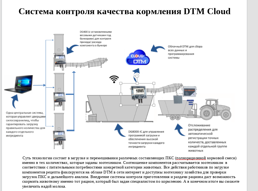 — Функция автоматической корректировки рациона по сухому веществу, опираясь на данные анализатора кормов в ковше погрузчика.